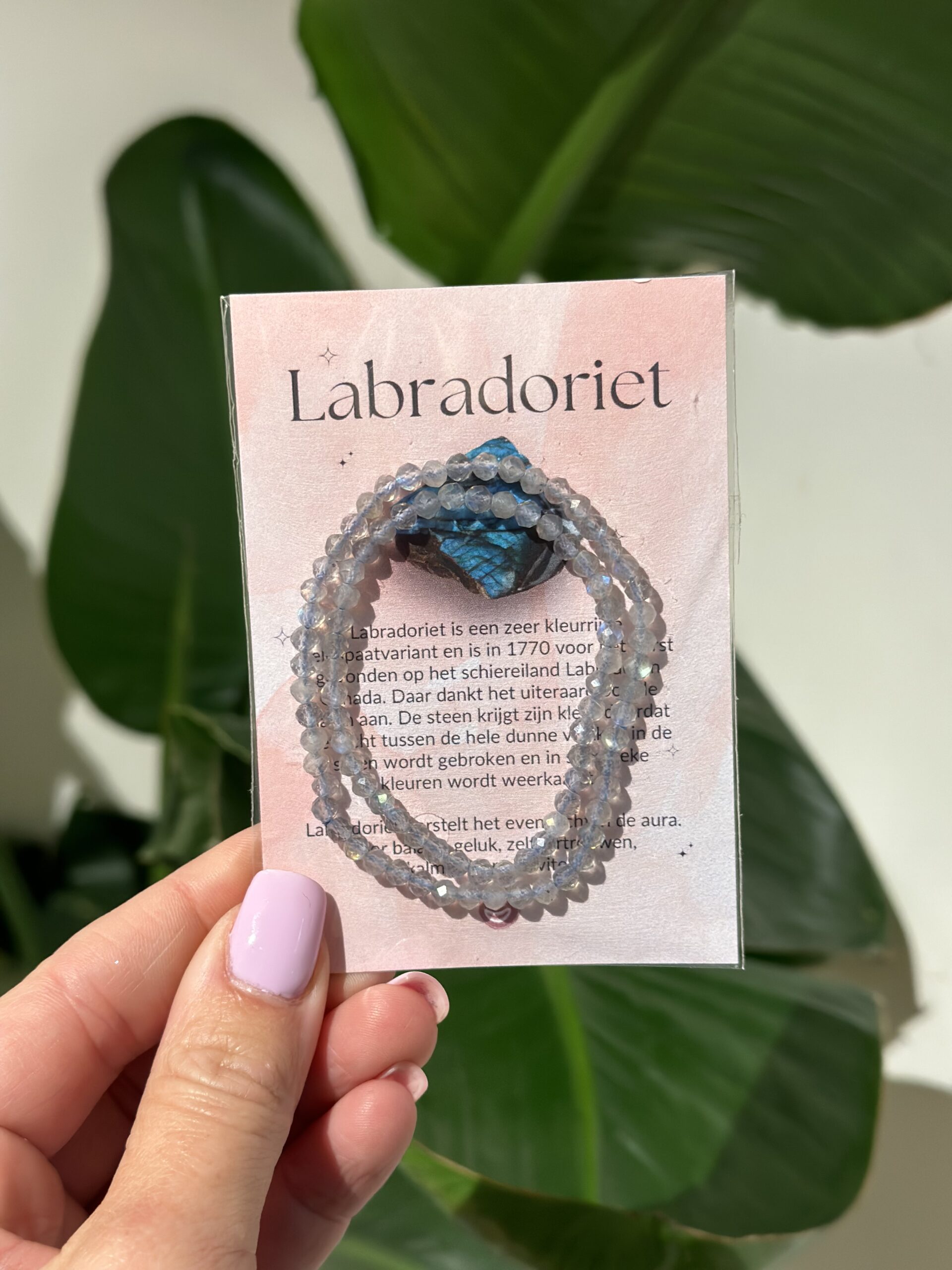 Labradoriet is een veldspaat (plagioklaas), dat ontstaat in pegmatieten en basische magmatieten. Het karakteristieke kleurenspel van de Labradoriet wordt veroorzaakt door de lichtbreking op microscopisch kleine kristalletjes van verschillende donkere mineralen, die georiënteerd zijn in de richting van de belangrijkste splijtvlakken. Labradoriet komt meestal vormeloos of korrelig voor.